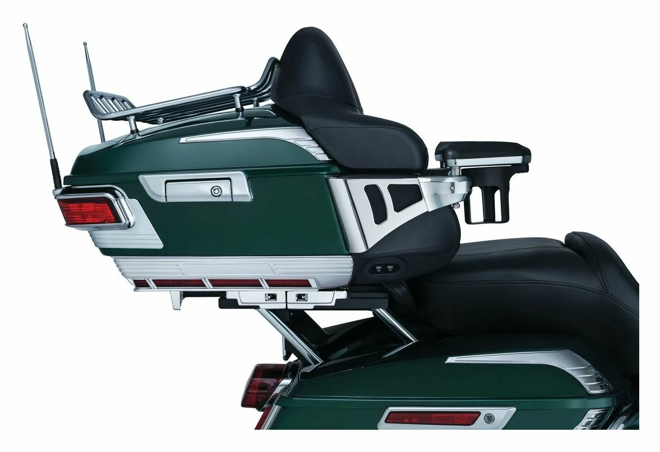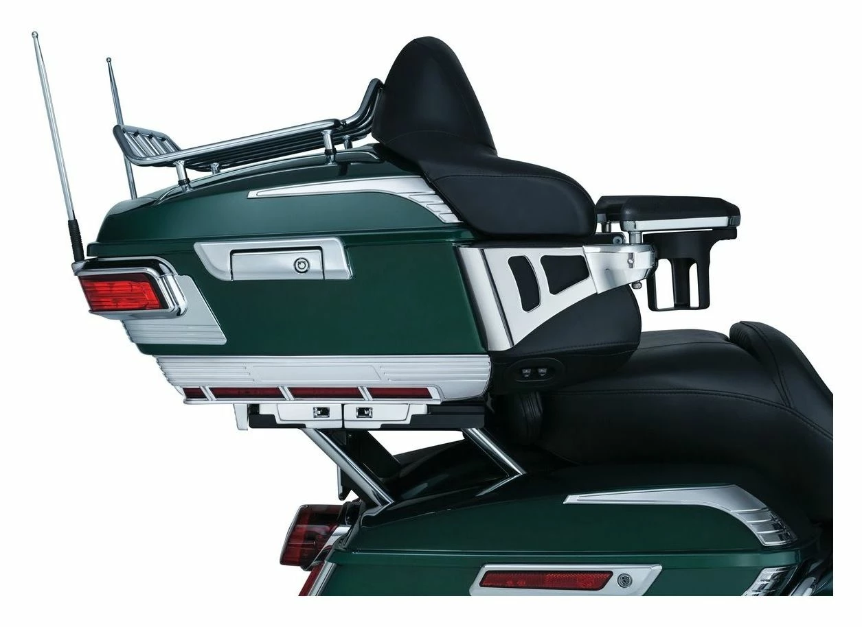 Give your passenger the space they deserve. The Kuryakyn Adjustable Tour-Pak Relocator does just that with a flip of the easily operated locking levers. Allows adjustment of the Tour-Pak from 1″ forward to 3″ back from the stock position without tools. Interlocking aluminum extrusions ensure smooth, controlled motion. The locking levers and rear accent panel are elegantly designed and beautifully chromed. An extended-length vinyl pad/wiring cover for the front of the Tour-Pak is included for a factory finish appearance.
