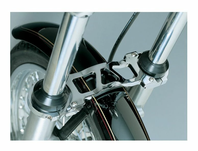 The Kuryakyn Fork Brace securely ties the fork sliders together for a more rigid, smoother operating front end. By reducing fork flex, one can enjoy more aggressive, controlled cornering, smoother riding, and straighter, more predictable stopping. High-quality, chrome-plated, die-cast aluminum construction. Clamps to the lower fork leg below the dust cap and has adjustability that prevents binding that may occur with one-piece fork braces.