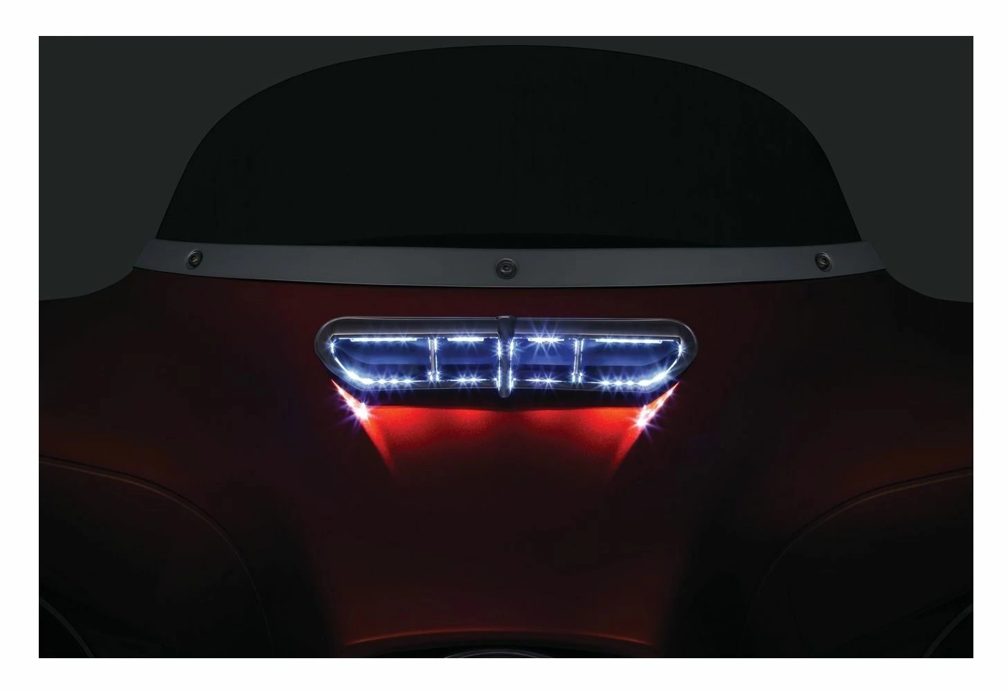 Turn heads and add a new depth of style to your front fairing. This LED fairing vent accent adds a soft white glow, increasing visibility while enhancing the look of the Rushmore Batwing fairing. Installation is painless thanks to plug-&-play wiring that will get you back on the road in no time.