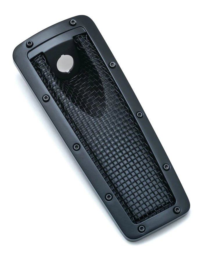 A custom new look that transforms the dash console. Aluminum outer frame and baseplate with steel mesh insert creates a three-piece design for custom-painting individual components.