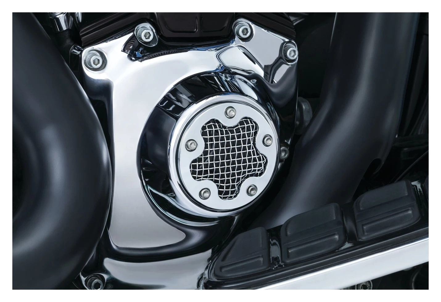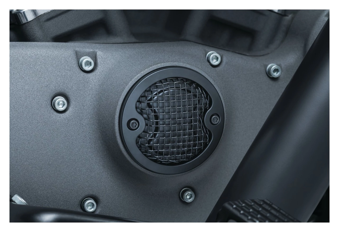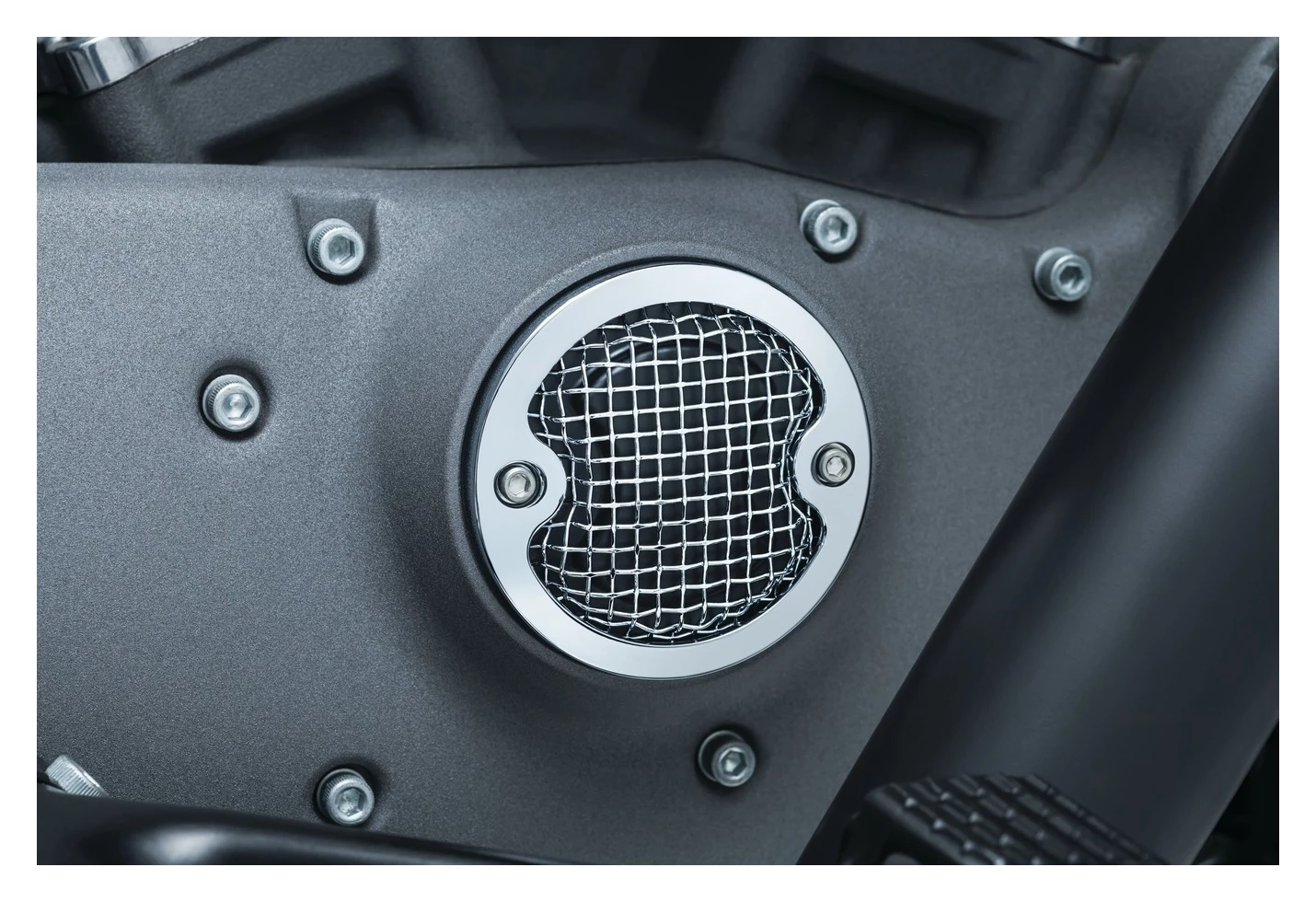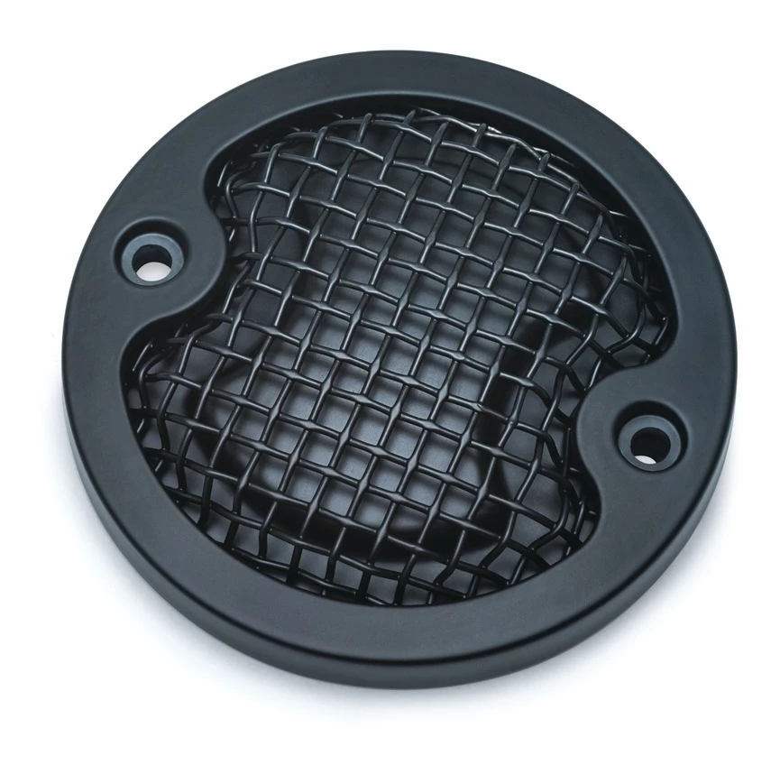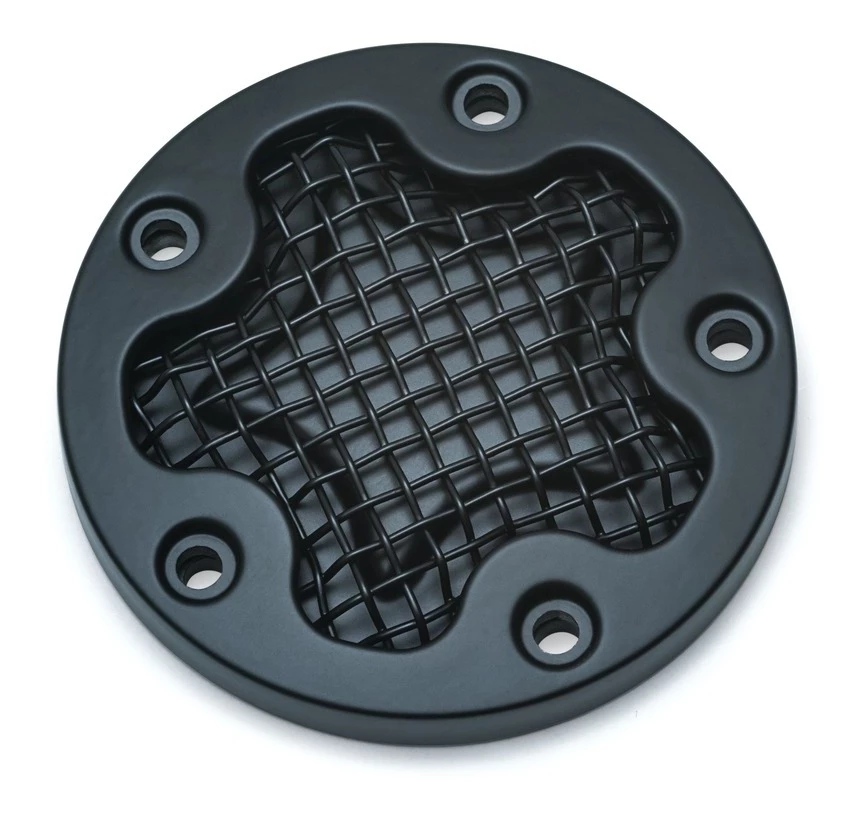 Bolt-on replacement for stock timing covers with a unique three-piece design that provides a rugged and dynamic textured appearance. Formed steel mesh insert is secured by the aluminum baseplate and outer frame upon installation with included hardware.