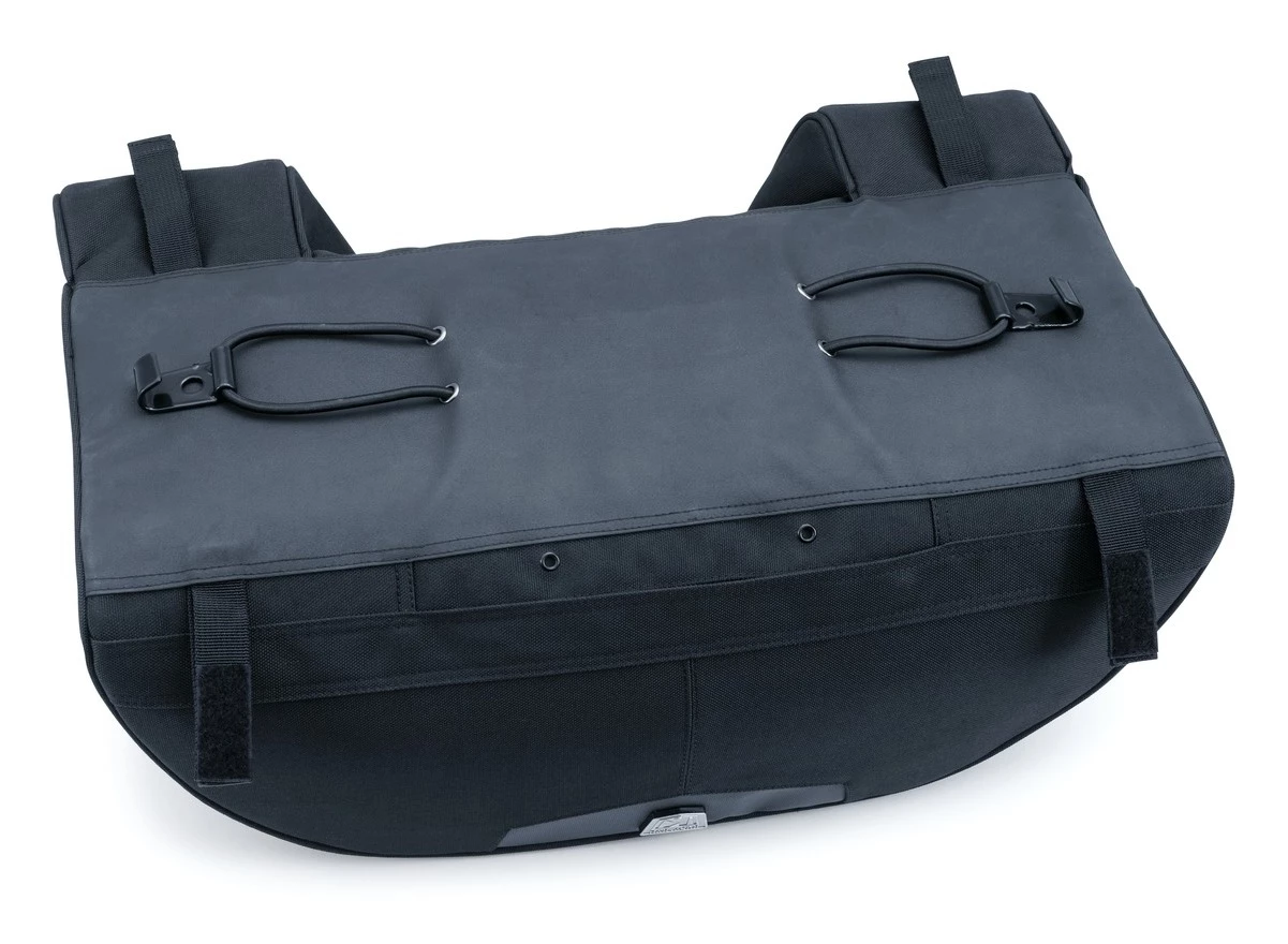 The Hitchhiker is one of the most versatile trunk rack bags in the business. Integrated elastic shock cords with hook-&-loop fasteners make secure mounting a breeze on virtually any tour trunk-mounted luggage rack. This updated version to the Deluxe Convertible Bag features a wider main opening for easy access, external pockets with MOLLE material for modular attachments and an external bungee storage system.