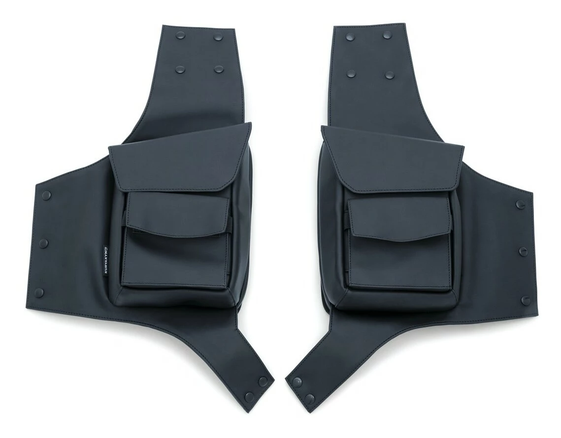 These handy pouches securely attach to Harley-Davidson models equipped with saddlebag guards, offering up convenient external storage for quick access to cell phones, wallets, firearms or other small items. Sold in pairs, features include a larger main compartment with heavy-duty magnetic closures, and a smaller external expandable pocket with high-strength Velcro closure.