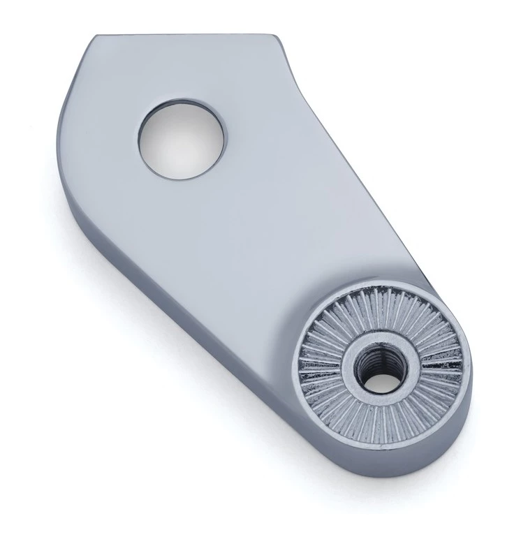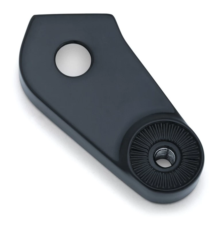 Mount yourΒ Kuryakyn Curved Side-Mount License Plate FrameΒ with one of these slick little mounts. They have a clean style and a chrome or black finish and easily bolts to the bottom shock bolt of the motorcycle.