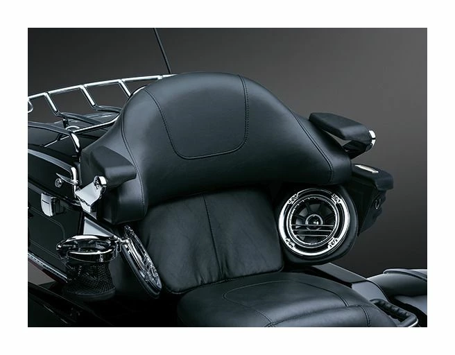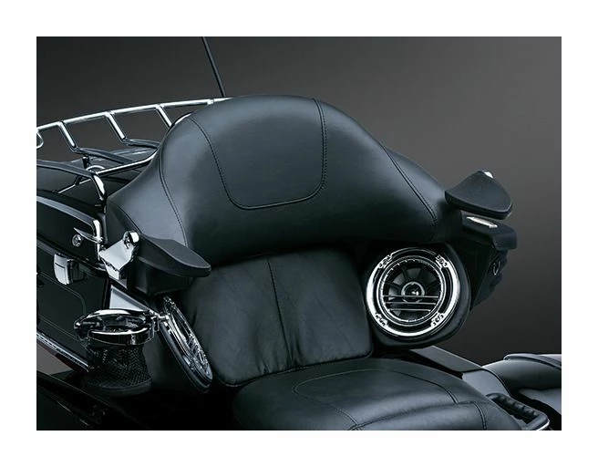 Ultimate comfort and convenience in a compact, sturdy package. Support brackets are nearly invisible and fasten between Tour-Pak lid and pad. Each arm has two mounting locations with adjustable stops at the pivot for fine tuning pad position. Padded over-molded arm folds back out of the way for a stealth look.