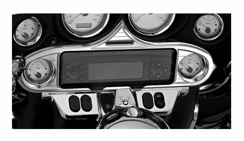 Get the over the top look without the over the top price with the chrome stereo accent from Kuryakyn. Made from lightweight ABS, this great looking chrome accent is just enough to set your bike in a class all its own. Installation is a snap with no tools or dis-assembly required.