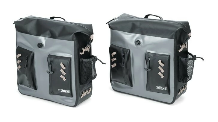 Inspired by adventure-style soft luggage, Torke Dry Bags use fully waterproof RF-welded TPU construction and IPX7-rated waterproof zippers. A semi-rigid internal structure backs up the tough polyurethane skin and helps the bags keep their shape when partially filled. Preventing small items from being lost, the inside of the bags are finished with a high visibility material to add contrast with the bag’s contents.ย The Torke Bags offer interior hook and loop pouches, external waterproof stash pockets, lockable zipper pulls, web bottle pockets (for water or fuel), neoprene organizers for tablets or laptops and carrying handles for easy portability off the bike. An air valve reduces excess bulk and helps the Torke Bags maintain a slim profile.
