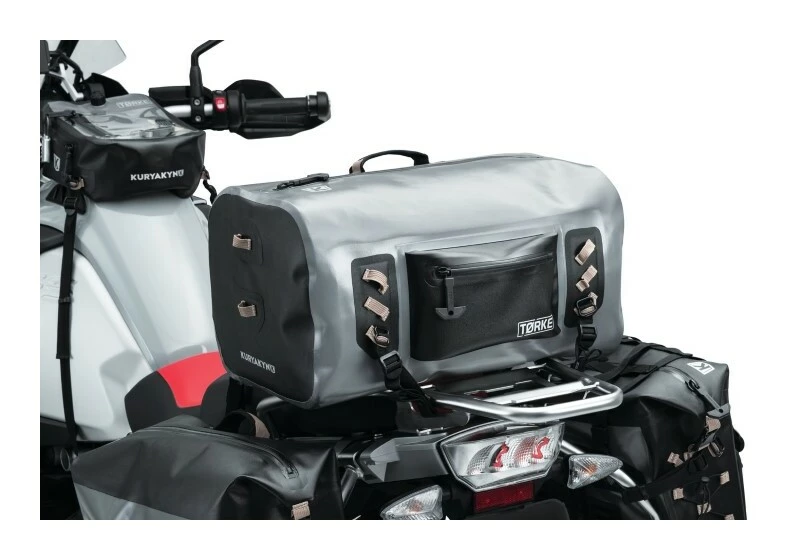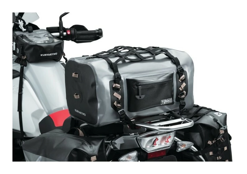 The 35 liter Torke Dry Bag Duffle is a side-loading dry bag with full-length waterproof zipper. A universal fitting kit is included and should provide an easy installation on most motorcycles. The Torke Dry Bag Duffle includes a removable cargo net for additional cargo carrying ability. A removable, padded shoulder strap makes for easy transport when off the bike.ย