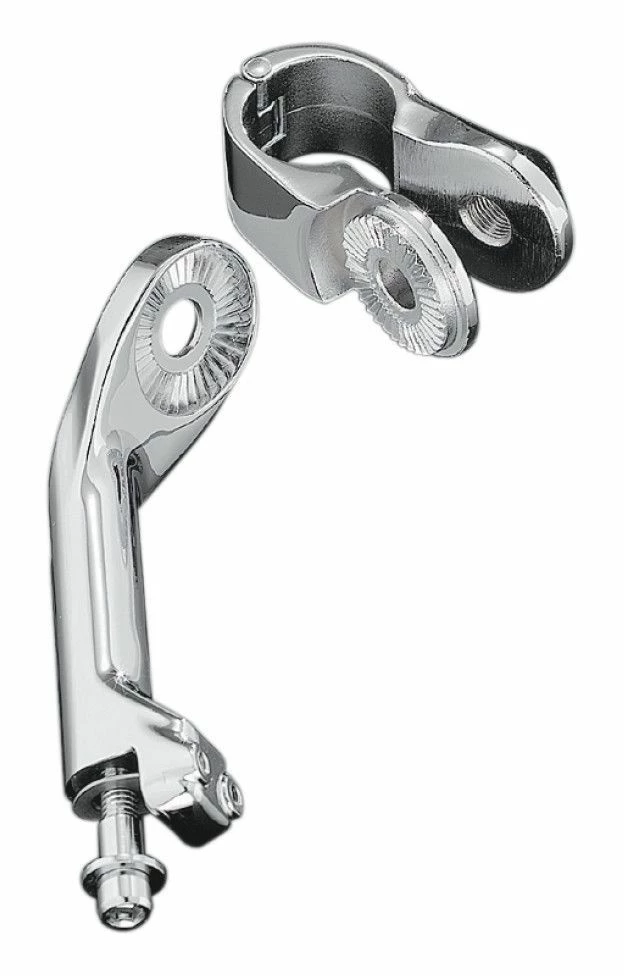 These Tour Tech cruise mounts with positive locking quick clamps offer an incredible range of adjustability. The entire assembly may be moved up or down on the engine guard, and the arm and footpeg may be further adjusted along a vertical or horizontal arc. A unique clevis permits angle adjustment of the footpeg. The heavy-duty quick clamp and sturdy offset armย ensuresย the footpegs will clear fairing lowers and stay where you put them.