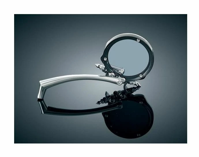 These might just be the nastiest mirrors on the road. The mirror adjustment mechanism is a swivel ball between two opposing pins that are threaded to allow quick, easy tension adjustment. The smoothly arched stem positions the center of the mirror head about 4 3/8″ above and 5 1/2″ out from the mounting point on the handlebar control. Hardware for a variety of H-D mounting applications is included.ย